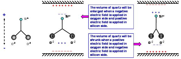 石英材料中的二氧化硅分子(SiO2) 在正常狀態(tài)下, 其電偶極是互相平衡的電中性. 在(圖二左)的二氧化硅是以二維空間的簡化圖形. 當(dāng)我們在硅原子上方及氧原子下方分別給予正電場及負(fù)電場時, 空間系統(tǒng)為了維持電位平衡, 兩個氧原子會相互排斥, 在氧原子下方形成一個感應(yīng)正電場區(qū)域, 同時在硅原子上方產(chǎn)生感應(yīng)負(fù)電場區(qū)域.
