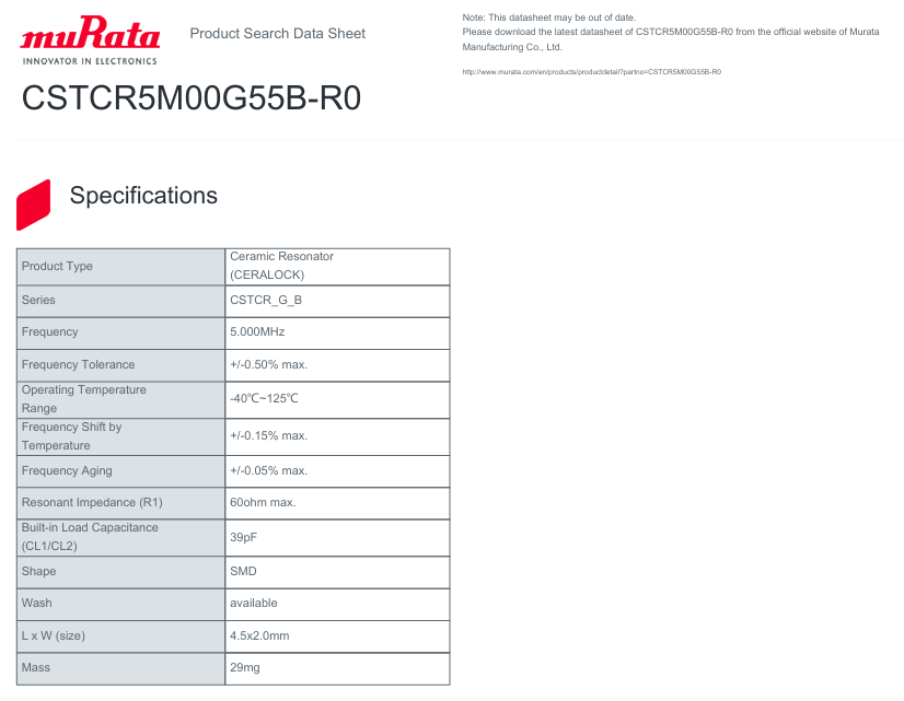 CSTCR5M00G55B-R0陶瓷晶振,日本村田muRata晶振,4520 5M車規晶振