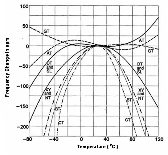 大部份的石英晶體產(chǎn)品是用于電子線路上的參考頻率基準或頻率控制組件, 所以, 頻率與工作環(huán)境溫度的特性是一個很重要的參數(shù). 事實上, 良好的頻率與溫度(frequeny versus temperature)特性也是選用石英做為頻率組件的主要因素之一. 經(jīng)由適當?shù)亩x及設計, 石英晶體組件可以很容易的就滿足到以百萬分之一 (parts per million, ppm) 單位等級的頻率誤差范圍. 若以離散電路方式將LCR零件組成高頻振蕩線路, 雖然也可以在小量生產(chǎn)規(guī)模達到所需要的參考頻率信號誤差在ppm或sub-ppm等級要求, 可是這種方式無法滿足產(chǎn)業(yè)要達到的量產(chǎn)規(guī)模. .jpg)