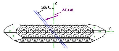 在各種不同種類的切割角度方式中, AT角度切割的石英芯片適用在數(shù)MHz到數(shù)佰MHz的頻率范圍,是石英芯片應(yīng)用范圍最廣范及使用數(shù)量最多的一種切割應(yīng)用方式. 在(圖五)中, 從石英晶棒X-軸向的上視圖, 可以看到對Z-軸向旋轉(zhuǎn)約35度的AT 方向. 這在大量生產(chǎn)的技術(shù)上也是很好達(dá)成的一種作業(yè)方式.境保護(hù)方針.jpg)