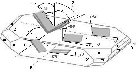 依據(jù)不同的應(yīng)用領(lǐng)域及工作溫度需求, 因應(yīng)了許多不同的石英切割角度種類. 例如AT-, BT-, CT-, DT-, NT, GT…..等不同的切割板片. 不同的切割方向的板片具有不同的彈性常數(shù)張量(elastic constant tensor), 不同的壓電常數(shù)張量(piezoelectric constant tensor)及不同的介電常數(shù)張量(dielectric constant tensor). 這些張量在石英組件的設(shè)計(jì)及應(yīng)用上展現(xiàn)了不同的振蕩及溫度特性. (圖三)表現(xiàn)了在Z-plat石英結(jié)構(gòu)上,幾種不同方向的石英板片切割方式..jpg)