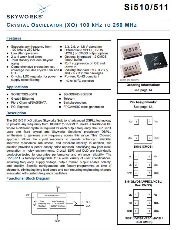 編碼511ABA25M0000BAG,Si510/511 XO時鐘石英晶體振蕩器采用了Skyworks Solutions公司先進的DSPLL技術(shù)提供從100千赫到250兆赫的任何頻率。不像傳統(tǒng)的XO其中每個輸出頻率需要不同的晶體,Si510/511使用一個固定晶體和Skyworks Solutions的專有DSPLL合成器在這個范圍內(nèi)產(chǎn)生任何頻率。這IC-based方法允許晶體諧振器提供更高的可靠性,提高了機械穩(wěn)健性,穩(wěn)定性極佳。此外,這解決方案提供卓越的電源噪聲抑制,簡化低抖動時鐘在嘈雜的環(huán)境中產(chǎn)生。晶體ESR和DLD是獨立的生產(chǎn)測試,以保證性能和提高可靠性。Si510/511可在工廠配置,適用于各種用戶規(guī)格;包括頻率、電源電壓、輸出格式、輸出使能極性、和穩(wěn)定性。特定的配置是在出廠時編程的運輸,消除了漫長的交貨期和非經(jīng)常性的工程費用與自定義頻率振蕩器相關(guān)聯(lián)。