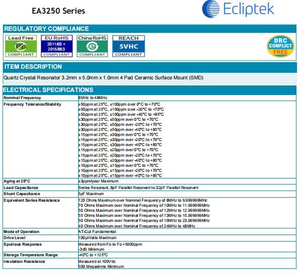 | EB3250AYA08-8.000M TR | Ecliptek無源晶振 | EB3250 | MHz 晶體 | 8 MHz | ±50ppm | ±30ppm | 8pF | CRYSTAL 8.0000MHZ 8PF SMD |