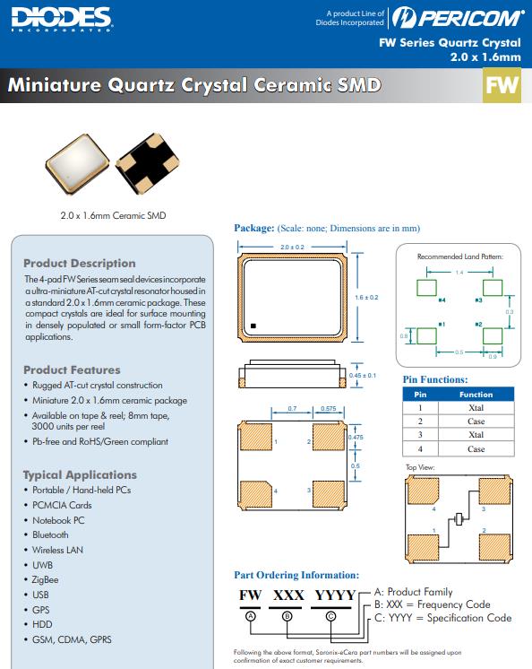 FW374WFMR1緊湊型石英晶體是手持電腦最佳甄選,Diodes作為臺灣知名晶振品牌公司,一直以來專注于研發(fā)生產(chǎn)各種各樣高質(zhì)量的產(chǎn)品,同時為高質(zhì)量應(yīng)用特定標準產(chǎn)品全球制造商與供貨商,產(chǎn)品涵蓋廣泛領(lǐng)域,包括獨立、邏輯、模擬及混合訊號半導(dǎo)體市場。Diodes服務(wù)的市場包括消費性電子、計算機、通訊、工業(yè)及汽車市場。百利通亞陶公司利用自身對于市場的了解開發(fā)眾多高質(zhì)量的石英晶體產(chǎn)品,也確保所生產(chǎn)的產(chǎn)品能夠滿足用戶不同的需求.