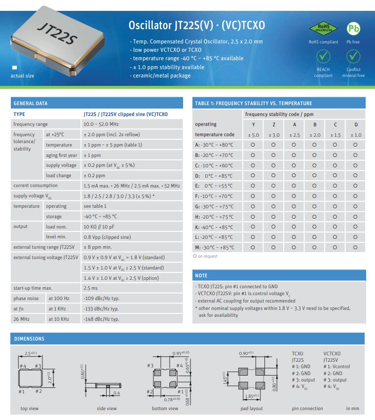 這些TCXO和VCTCXO適用于1.8V至3.3V范圍內的固定工作電壓水平.JT11S是純