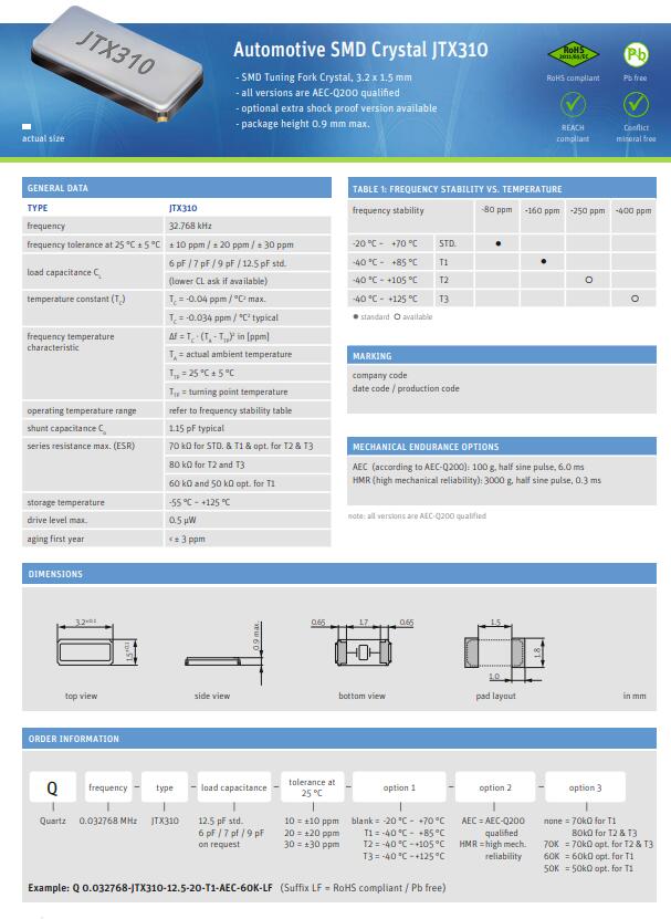 | Q 0.032768-JTX310-12.5-20-T2-HMR-LF | Jauch Quartz | JTX310 | 32.768kHz | ±20ppm | 12.5pF | -40°C ~ 105°C | 2 | 3215 |