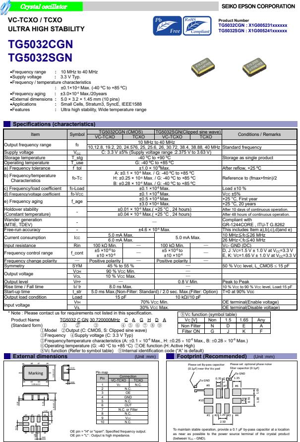 | X1G005241001300 | TG5032SGN | 40.000000 MHz | 5.00 x 3.20 x 1.45 mm | 3.135 to 3.465 V | +/-1.0 ppm | -40 to ++85 °C | +/-0.28 ppm |